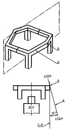 a - верхний элемент ROPS, к которому прикладывают боковую нагрузку; b - наиболее удаленная точка элемента от вертикальной продольной плоскости; c - вертикальная линия, проходящая через точку b; d - вертикальная плоскость, проходящая параллельно продольной оси симметрии машины через линию c; e - боковая имитируемая плоскость грунта Рисунок 1 - Определение положения боковой имитируемой плоскости грунта LSGP 3.12.2 вертикальная имитируемая плоскость грунта (VSGP): Поверхность, проходящая через верхнюю точку ROPS и переднюю (заднюю) часть машины, которая соприкасается с фунтом. При
