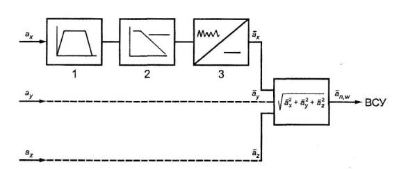 2.1 Измерению, в соответствии со схемой измерительного тракта, приведенной на рисунке 1, подлежат ортогональные корректированные значения виброускорения или взвешенное суммарное ускорение (ВСУ). Ускорение по трем ортогональным направлениям воспринимается акселерометрами и преобразуется в форму общего вибрационного значения взвешенного суммарного ускорения.