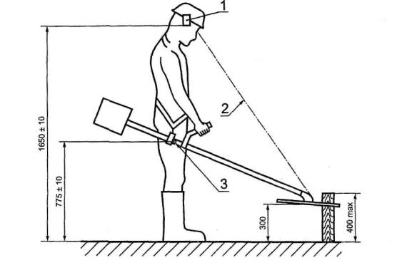 1 - микрофон; 2 - направление взгляда оператора на режущий инструмент; 3 - место соединения кустореза с подвесом Рисунок 1 - Положение оператора, микрофона, кустореза, древесины при измерении уровня звука в рабочих условиях крепление должно быть подогнано по размеру оператора таким образом, чтобы точка пересечения оси рукоятки с перпендикуляром от точки ее соединения с креплением, когда кусторез находится в равновесии, находилась на высоте (775 ± 10) мм над землей; ручка кустореза