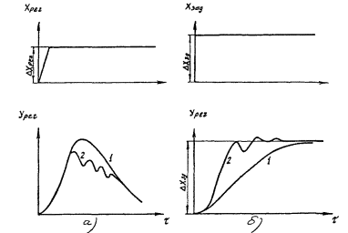 при воздействии регулирующим органом; б - при воздействии задатчиком; 1 -