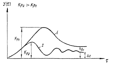 периодическим или колебательным. Основными показателями качества переходного процесса являются: статическая ошибка регулирования - D; динамическая ошибка - А1; длительность переходного процесса - Тпп; степень затухания периодического процесса - y. С изменением коэффициента усиления Kр показатели качества переходного процесса меняются по-разному. С