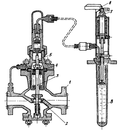 клапана, что уменьшает проходное сечение регулятора. При понижении температуры регулируемой среды объем термочувствительного