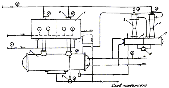 воздуховод рециркуляции Рис. 3. Схема холодильной машины: 1 - испаритель; 2 - главный эжектор; 3 - главный конденсатор; 4 - конденсатный насос; 5 - вспомогательный эжектор I ступени; 6 - вспомогательный эжектор II