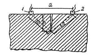 где h - глубина трещины, см; V - скорость распространения ультразвука на участке без трещин, см/мкс: t1 - время прохождения ультразвука на участке с трещиной, мкс; ta - время прохождения ультразвука на участке без трещины. .мкс: l - база измерений для обоях участков, см