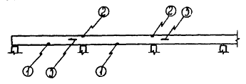 изгибаемых конструкциях до 0,5 - 6.17. Продольные трещины некоррозионного и неусадочного характера в сжатых зонах изгибаемых элементов перекрытий особенно в сочетании с отслоениями, лещадками и отколами бетона служат признаком разрушения сжатого бетона. 6.18. Усадочные трещины, как правило, появляются в защитных слоях бетона, а также в местах "исправлений" раковин в бетоне, что происходит вследствие высокого содержания в этих слоях влаги и ее последующего быстрого высыхания. Данные трещины не следует смешивать с трещинами в самой конструкции, к несущей способности которой они отношения не имеют. 6.19. Трещины от неравномерных осадок колонн рамных конструкций каркаса бункерно-деаэраторной этажерки возникают обычно в сжатых зонах неразрезных конструкций перекрытий (поперечных рам, продольных балок). При этом косые трещины в пределах неравномерно осевшей опоры получают направление, обратное обычному. В этих случаях следует выяснить причины осадок и принять меры по их устранению. 6.20. При появлении продольных трещин в растянутых зонах железобетонных элементов перекрытий для установления наличия и степени коррозии арматуры производится вскрытие. 7. ВЫЯВЛЕНИЕ ФАКТИЧЕСКОГО АРМИРОВАНИЯ ЖЕЛЕЗОБЕТОННЫХ ЭЛЕМЕНТОВ ПЕРЕКРЫТИЙ7.1. Для выявления армирования железобетонных конструкций существует несколько способов: вскрытие арматуры ответственных сечений; сквозное просвечивание конструкций; электромагнитный способ. В условиях эксплуатации перекрытий главных корпусов наиболее приемлемо вскрытие арматуры на заранее намеченных расчетных сечениях. 7.2. Места вскрытия должны быть выбраны с учетом напряженного состояния элементов конструкций перекрытий. При определении мест вскрытия следует максимально использовать имеющиеся дефектные участки с наличием отслоений защитного слоя, продольных трещин, сколов, участков с механическими повреждениями и т.д. 7.3. Вскрытие арматуры производится в следующей последовательности: намечаются места вскрытий; прорубаются штрабы в намеченных местах; измеряются диаметры арматуры, толщина защитного слоя, геометрические размеры вскрытых сечений; вырезаются стержни арматуры для изготовления образцов, подлежащих испытанию (с предварительным усилением ослабляемых стержней); заделываются места вскрытий цементным раствором не ниже марки 200 с предварительной их расчисткой и промывкой водой. Для обнажения стержней арматуры с целью измерений их диаметров и расположения в сечении необходимо удалить слой бетона. 7.4. В изгибаемых многопролетных балках перекрытий необходимо вскрывать: продольную арматуру в середине пролета (снизу); продольную арматуру над опорами; поперечную арматуру у опор. Места вскрытий арматуры в многопролетной балке и характер вскрытий представлены на рис. 2-5.