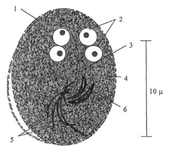 Lamblia intestinalis 1 - наружная оболочка, 2 - ядра, 3 - аксостиль, 4 - цитоплазма, 5 - жгутиковый