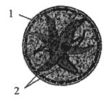 Ооциста Cryptosporidium parvum 1 - наружная оболочка, 2 -