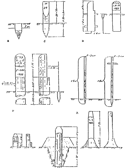б - сторожки; в - створные столбы; г - угловые столбы; д - вехи; е - репера.