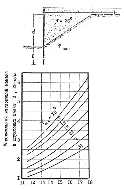 График зависимости величины максимального изгибающего момента в шпунтовых сваях
