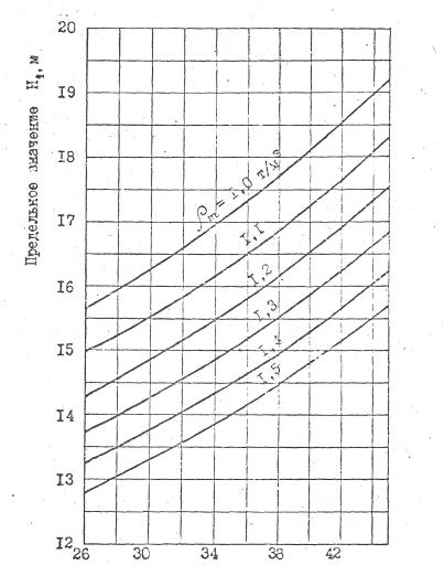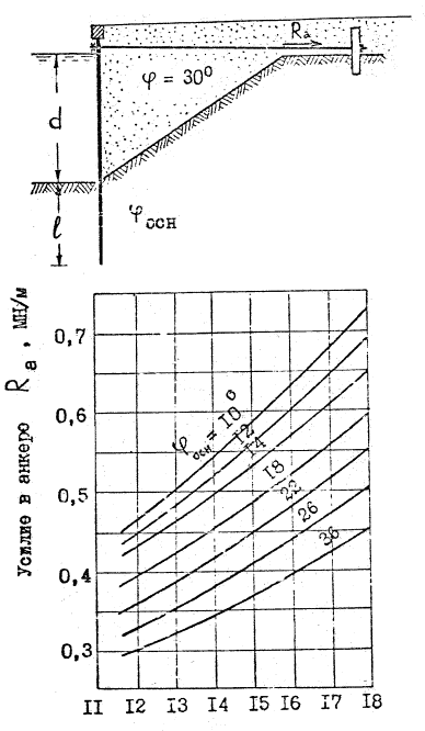усилий, принимаются в соответствии с 3. Определение Усилий3.1. Расчет нормативных значений изгибающих моментов в лицевой стенке болъверка, напряжений в зоне контакта "свая-грунт" деформаций шпунтовой стенки и перерезывающих сил следует определять сучетом деформации сооружения по программе в ЭВМ, приведенной в РТМ 31.3016-78. 3.2. Влияние нагруженной фундаментной части подкранового пути лицевую стенку больверка следует учитывать, если фундамент полностью расположен в пределах призмы обрушения. В этом случае дополнительную составляющую эпюры бокового давления грунтаот нагруженной фундаментной части следует определять по методике, изложенной в Приложении 1. 3.3. Для предварительного определения величин изгибающих моментов, анкерных усилий и глубин забивки, шпунтовых свай рекомендуется использовать графики, приведенные на рис. 2 - Рис.4. 3.4. Основные характеристики сварного зетового шпунта приведены в Приложении 2, а его расход в конструкции можно оценивать по таблице П. 3.1 Приложения 3. 4. ОСНОВНЫЕ РЕКОМЕНДАЦИИ ПО КОНСТРУИРОВАНИЮ4.1. Отсыпку за стенку причала