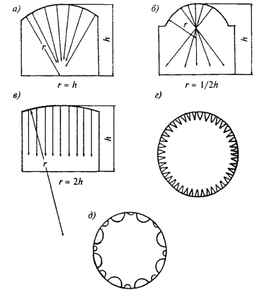 членение поверхности купола (рисунки 9, г и 9, д) или