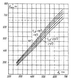 понижении температуры питательной воды и сохранении неизменного расхода пара Примечание. График построен исходя из того, что при понижении температуры питательной воды, например с 230 до 150°С, и неизменных паропроизводительности котла и расходе топлива энтальпия пара в пароперегревателе увеличивается (при рп.п = 100 кгс/см2) а 1,15 раза (со 165 до 190 ккал/кг), а температура пара с 510 до 550°С
