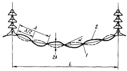 Oscillation) называются вызываемые ветром периодические колебания горизонтально расположенной (или занимающей положение, близкое к горизонтальному) пары проводов расщепленной фазы (расщепленных грозозащитных тросов), происходящие с одной или несколькими полуволнами на участках (называемых