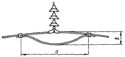 Геометрические размеры петлевых гасителей для проводов, не вошедших в табл. 3.4, могут быть определены по формулам [4] где в - ширина провеса петли, м; а - длина петли, м; К = 10-3 - коэффициент размерности, с/мм; D - диаметр провода, мм; Тэ - тяжение проводов при среднегодовой температуре, Н; т - масса провода, кг/м. 3.2.3. Для защиты от вибрации алюминиевых проводов сечением 120 - 300 мм2, проводов из алюминиевых сплавов АН и АЖ и других сечением 120 - 185 мм2, сталеалюминиевых проводов сечением 120 ¸ 300 мм2, стальных тросов сечением 50 ¸ 120 мм2 могут применяться гасители вибрации петлевого типа из трех петель, конструкция и размеры которых показаны на рис. 3.2. Петлевые гасители этого типа также выполняются из отрезков провода той же марки, что и защищаемый провод. Крепление петель производится трехболтовыми плашечными петлевыми зажимами типа ПА. Размеры петель определяются по формулам (3.1), (3.2). Трехпетлевой гаситель по эффективности гашения вибрации не уступает гасителям Стокбриджа. Применение трехпетлевых гасителей рекомендуется в районах с частой пляской проводов, поскольку при возникновении пляски полностью отсутствует опасность повреждения защищаемого провода гасителем. В случае же применения гасителей Стокбриджа при возникновении пляски существует опасность повреждения провода в местах установки гасителей типа ГВН или ГПГ (ГПС), разрушения самих гасителей. 3.2.4. Основным способом защиты от вибрации ВЛ с одиночными проводами и тросами является применение гасителей Стокбриджа. Для защиты от вибрации алюминиевых проводов и проводов из алюминиевого сплава АН сечением 120 мм2 и более, сталеалюминиевых проводов, проводов из алюминиевого сплава АЖ и проводов АЖС из алюминиевого сплава АЖ со стальным сердечником сечением 95 мм2 и более, медных и стальных проводов и тросов сечением 50 мм2 и более рекомендуется применение стандартных гасителей вибрации ГВН [5] или ГПГ [6]. Конструкция гасителей типа ГВН, ГПГ дана в приложении 1 (рис. П1.6) геометрические и физические параметры приведены в табл. П1.3, П1.4 приложения. Гаситель ГПС отличается от гасителей ГПГ только конструкцией зажима. 3.2.5. В зависимости от длины пролетов и тяжения проводов (тросов) гасители вибрации Стокбриджа устанавливаются на проводах с обеих сторон пролета (рис. 3.3, а), либо только с одной стороны пролета (рис. 3.3, б). Односторонняя установка гасителей допускается в следующих случаях: в пролетах длиной менее 150 м, независимо от значения механического напряжения в проводах (тросах); при этом не допускается односторонняя установка гасителей, если трасса ВЛ проходит по местности категории I; в пролетах длиной 150 - 200 м, если расчетное механическое напряжение в проводах (тросах) при среднегодовой температуре не превышает значений, указанных в табл. 3.3. Рис. 3.1. Петлевой гаситель вибрации Рис. 3.2. Трехпетлевой гаситель вибрации Рис. 3.3. Схема установки гасителей вибрации на ВЛ: а - установка гасителей с обеих сторон пролета; б - установка гасителей с одной стороны пролета 3.2.6. Выбор типов гасителей Стокбриджа для проводов различных марок, предназначенных для установки в обычных пролетах ВЛ, производится согласно табл. 3.5. В заказной спецификации на поставку гасителей ГВН необходимо указывать только тип гасителя. В спецификации на поставку гасителей ГПГ необходимо указывать как тип гасителя, так и марку плаше
