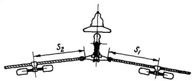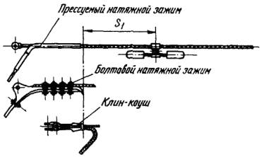 Рис. 3.4. Расположение гасителей вибрации у поддерживающего зажима Рис. 3.5. Расположение гасителя вибрации у натяжных зажимов При установке одного гасителя с каждой стороны пролета эффективность работы гасителей повышается, если в начале и в конце пролета месторасположение гасителей несколько различается и определяется по формулам Вычисленные расстояния мест установки гасителей от зажима S1 и S2 округляются до ближайшего значения, кратного 0,05 м. 3.2.8. При установке гасителей у анкерных, анкерно-угловых и транспозиционных опор с обводными петлями (шлейфами), присоединяемой к проводам с помощью ответвительных зажимов, располагаемых на некотором расстоянии от натяжных зажимов, на этих проводах гасители вибрации следует устанавливать за ответвительным зажимом на одном из указанных выше расстояний (S1 - в начале пролета и S2 в конце), считая от места выхода провода из ответвительного зажима в сторону пролета. При установке гасителей Стокбриджа необходимо следить, чтобы гаситель был расположен строго под проводом и надежно закреплен. 3.2.9. На вновь сооружаемых ВЛ, во избежание повреждений проводов вибрацией, перекладка их в поддерживающие зажимы и установка гасителей