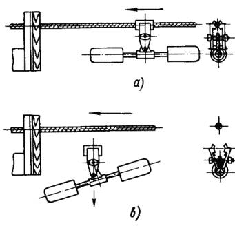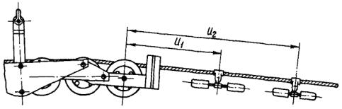 Рис. 4.4. Расположение двух гасителей вибрации у натяжного зажима в переходном пролете длиной 500 - 1500 м Рис. 4.5. Расположение двух гасителей сбрасывающегося типа у многороликового подвесного устройства 4.2.7. Учитывая, что в результате интенсивной вибрации повреждение проводов и тросов в больших переходных пролетах может наступить в течение первых же месяцев после монтажа, установка гасителей вибрации в таких пролетах должна производиться не более, чем через 5 сут. после монтажа проводов и тросов. 4.2.8. Защита от вибрации проводов и тросов в пролетах длиной более 1500 м, а также независимо от длины пролета для проводов работающих при тяжении более 180 кН, должна производиться по специальному проекту. 4.2.9. Порядок установки гасителей вибрации в больших переходных пролетах приведен в приложении 1. 5. ЗАЩИТА