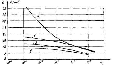 0,27σв; 4 - пограничная кривая СИГРЭ В результате обобщения многочисленных данных усталостных испытаний, проводившихся разными исследователями с проводами из алюминия, алюминиевого сплава и сталеалюминевыми, разработаны рекомендации [7] по применению пограничной кривой безопасных напряжений (см. рис. П1.2). Кривая описывается уравнением где B = 450, z = - 0,2 для Nc £ 1,56·107; B = 263, z = - 0,17 для Nc > 1,56·107; Nc - число циклов колебаний провода. Смысл пограничной кривой состоит в том, что риск усталостных повреждений провода отсутствует, если за время его эксплуатации число циклов колебаний с изгибным напряжением σ не превышает значения Nc, определяемого уравнением (П1.13). Таким образом, срок службы провода определяется не только амплитудами его колебаний или уровнями циклических изгибных напряжений, но также и накопленным числом циклов таких колебаний, т.е. продолжительностью и частотой вибрации определенного уровня. 2. Влияние условий прохождения