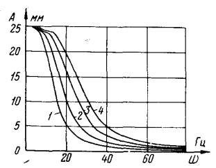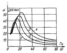 Рис. П 1.3. Зависимость угла вибрации провода от интенсивности турбулентности воздушного потока (It): I - ламинарный поток; 2 - It = 5 %; 3 - It = 10 %; 4 - It = 15 %