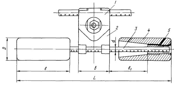 Рис. П 1.6. Конструкция гасителей вибрации типа ГВН (усовершенствованный), ГПГ: 1 - плашка; 2 - зажим; 3 - гибкий элемент; 4 - груз; 5 - втулка 3.3. Число устанавливаемых в каждом пролете гасителей вибрации Стокбриджа зависит от длины пролета, тяжения проводов и условий прохождения линии (категории местности по табл. 3.1). Как показывает опытная проверка в пролетах небольшой длины, при небольшом значении механического напряжения в проводах, при прохождении линии по местности 5 категории для снижения вибрации до безопасного уровня достаточна установка на проводах по одному гасителю с одной стороны пролета. В пролетах длиной более 200 м, при высоких значениях механического напряжения в проводах, при прохождении ВЛ по местностям 2 - 4 категории гасители должны быть установлены с обеих сторон пролета. В больших переходных пролетах длиной 500 - 1500 м, подверженных особо интенсивной вибрации, с каждой стороны пролета устанавливаются по два гасителя с разными частотными характеристиками. По два гасителя с каждой стороны пролета целесообразно устанавливать также при прохождении ВЛ с пролетами свыше 300 м по местности I категории, особенно на линиях, сооружаемых и эксплуатируемых в районах Крайнего Севера. Месторасположение гасителей в пролете, обеспечивающее наиболее эффективное гашение вибрации, определяется расчетным путем с учетом марки и тяжений провода. 3.4. Гаситель вибрации петлевого типа (рис. 3.1) представляет