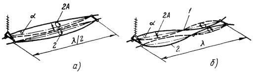 на подпролет; 1 - узел колебаний; 2 - пучность колебаний; λ - длина волны колебаний; А - амплитуда колебаний; a - угол колебаний в подпролетах;