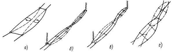 Рис. П 2.2. Виды колебаний проводов, вызываемых воздействием аэродинамического следа: а - колебания проводов в подпролетах; б - вертикальные колебания; в - горизонтальные колебания; г - крутильные колебания