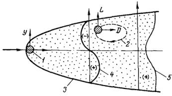 Рис. П2.3. Аэродинамические силы, действующие на подветренный провод: L - подъемная сила; D - сила лобового сопротивления; 1 - наветренный провод; 2 - траектория движения подветренного провода; 3 - граница аэродинамического следа; 4 - эпюра подъемной силы