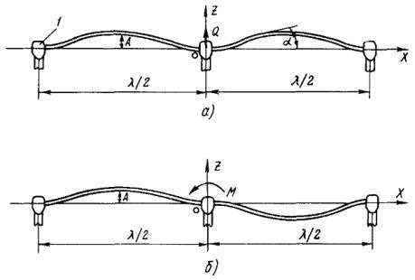 Рис. П 2.1. Формы колебаний проводов в подпролетах: а - с одной полуволной на подпролет; б - с двумя полуволнами