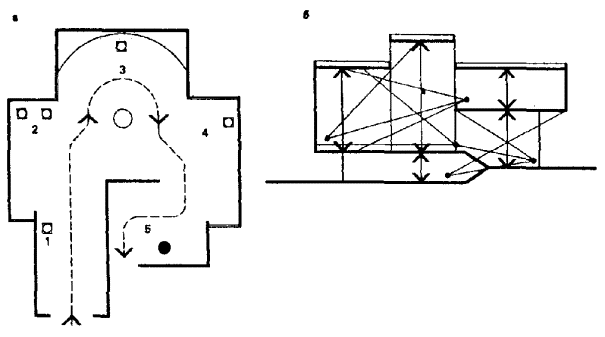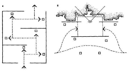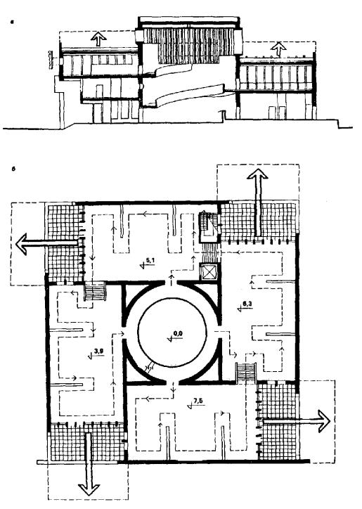 развитие; 5 - финал; б - пространственная организация экспозиции в разных