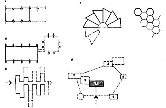системы; б - присоединение новых корпусов; в - линейное расширение; г - планировочные