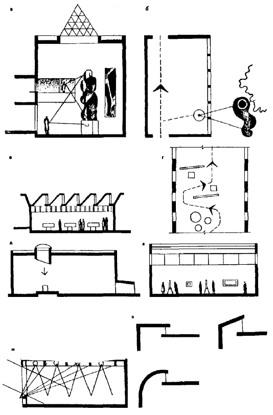 верхнее - искусственным; з - варианты решения верхнего освещения Рис. 16.