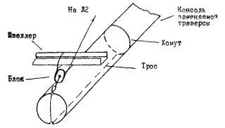 лебедкой). Тяговый трос (7) с его лебедки перебрасывается через траверсу и