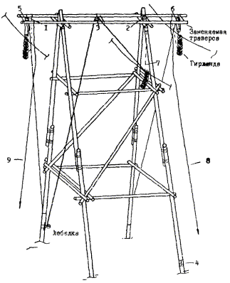 слабина всех тросов, начинается подъем опоры через траверсу старой опоры.