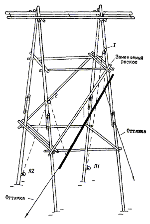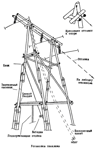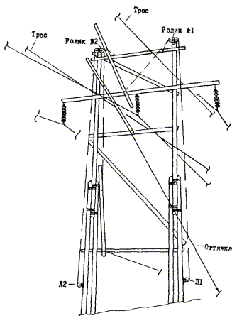 устанавливаются три временные оттяжки, закрепленные за стойку опоры. Вторые