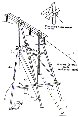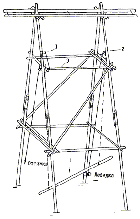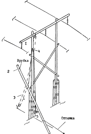 концы оттяжек крепятся к стволам деревьев, пням и т.п. Натяжение оттяжек