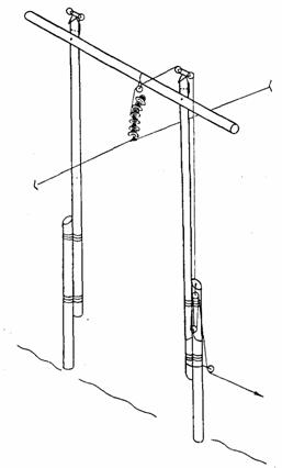 Нижние блоки крепятся к штырям, забиваемым в землю. Бесконечные канаты