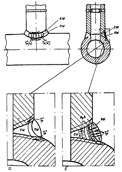 Кольцевые трещины (Трк): а - в подваренном шве (ПШ); развитие от ЗТВрп; б - в старом