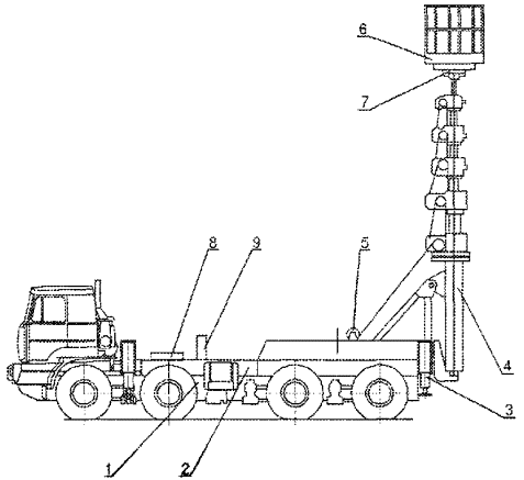 подъема; 7 - гидрооборудование; 8 - электрооборудование; 9 - устройства (приборы) безопасности Рисунок А.4 - Передвижной подъемник с рабочей платформой мачтового