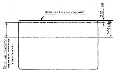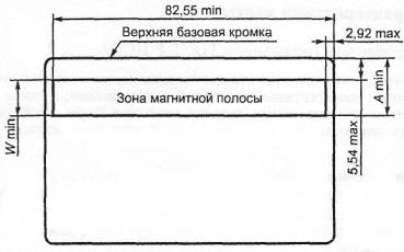 магнитной полосы, не должны нарушать ее функционирование. 5.1 Коробление в зоне магнитной полосы При размещении карты на плоской жесткой пластине магнитной полосой вниз и под воздействием усилия 2,2 Н, равномерно распределенного напротив магнитной полосы с лицевой стороны карты, полоса не должна отходить от поверхности пластины более чем на 0,08 мм. Как на лицевой, так и на оборотной сторонах карты в зоне, показанной на рисунке 1, не должно быть каких-либо искажений поверхности, неровностей или выступающих участков, нарушающих контакт между магнитной головкой и магнитной полосой. В случае если на лицевой или оборотной стороне карты имеется выступающий участок с панелью для подписи, то он должен располагаться на расстоянии не менее 19,05 мм от верхней кромки карты. Примечание - Выступающие участки или