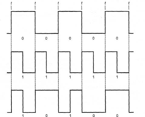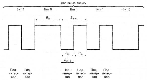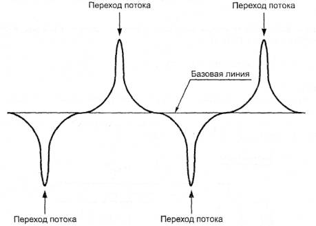 удовлетворять требованиям раздела 7. Рисунок 7 - Пример формы сигнала Метод кодирования, применяемый для каждой дорожки, известен как двухчастотная запись. Данный метод позволяет осуществлять последовательную запись самосинхронизирующихся данных. Кодирование включает в себя одновременную запись, как данных, так и переходов синхронизации. Переход потока, возникающий между синхронизирующими импульсами, означает, что данный бит - «единица»; отсутствие перехода потока между переходами синхронизации означает, что данный бит - «ноль» (см. рисунок 8). t - интервал самосинхронизации (хронирования) Рисунок 8 - Пример двухчастотного синфазного кодирования Данные должны быть записаны в виде синхронной последовательности