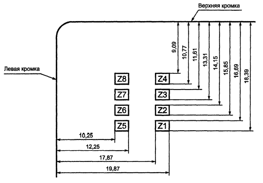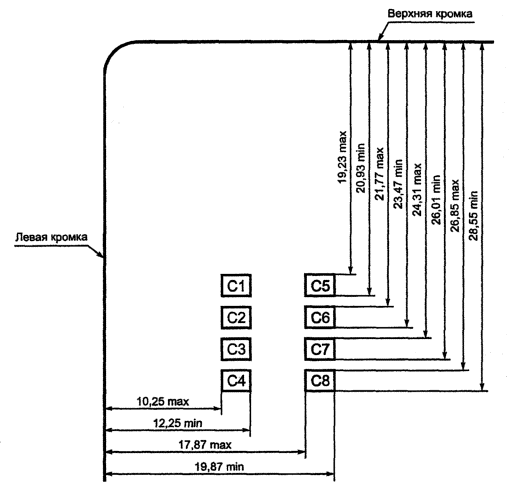 Рисунок 1 - Размеры контактов Стандарт не устанавливает максимальные размеры или форму контактов, за исключением требования, что контакты должны быть электрически изолированы друг от друга. 4 Число и расположение контактовКарта должна содержать восемь контактов С1-С8, расположенных согласно рисунку 2.