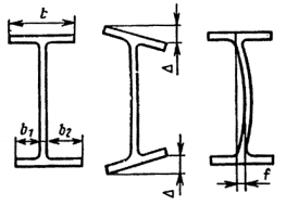 h - высота двутвара; b - ширина полки; s - толщина стенки; t - толщина полки; r - радиус сопряжения; I - момент инерции; W - момент сопротивления; S - статистический момент полусечения; i - радиус инерции.