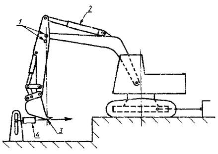 шарнир крепления ковша; 2 - усилие на рабочем органе; 3