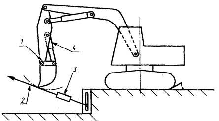 касательной к дуге, описываемой кромкой ковша вокруг шарнира ковша. Максимальное усилие на ковше