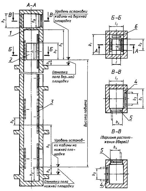1 - перекрытие шахты, 2 - кабина, 3 - дверь шахты, 4 - фасадная дверь, 5 - боковая дверь, 6 - противовес ПРИЛОЖЕНИЕ