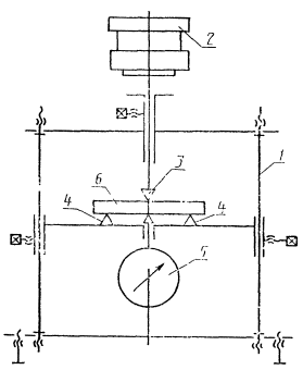 где Е- модуль упругости, МПа; Р - нагрузка, кг; l - расстояние между опорами, см; b - ширина балочки, см; h - высота балочки, см; g - величина прогиба, см. Принципиальная схема прибора для определения модуля упругости приведена на черт. 6. Черт. 6. 1