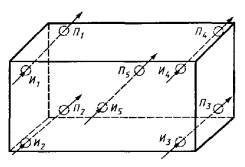 приемный электроакустические преобразователи; 1 - линия прозвучивания; l - база прозвучивания И1, И2, И3,