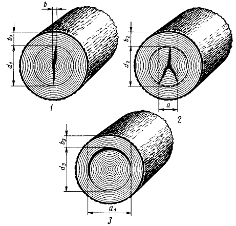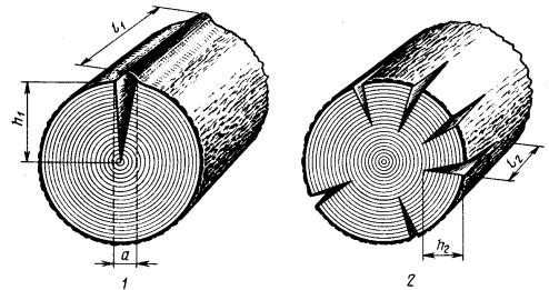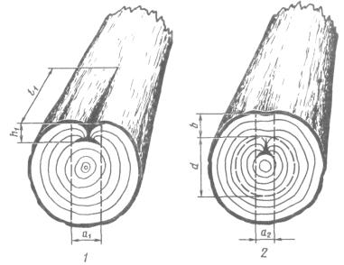 трещин в круглых лесоматериалах 1 - морозная; 2 - трещина