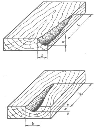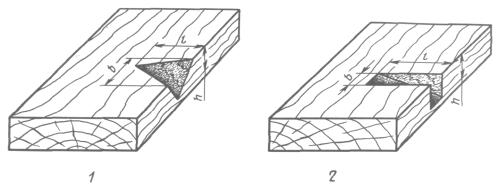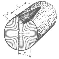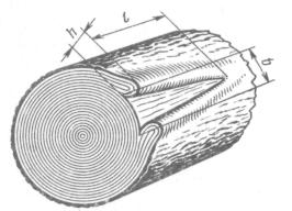 Боковые трещины (морозную, трещину усушки) измеряют по глубине и длине (черт. 13, размеры соответственно h1, h2 и l1, l2). Если
