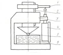 стандарта преследуется по закону Настоящий стандарт распространяется на древесностружечные плиты горячего плоского и экструзионного прессования и устанавливает метод определения твердости. Стандарт не распространяется на плиты с облицованной или лакированной поверхностью. Стандарт полностью соответствует СТ СЭВ 4189-83. 1. Аппаратура1.1. Для определения твердости применяют следующую аппаратуру: - машину испытательную по ГОСТ 7855-84 с пределом измерения нагрузки 5000 Н и с погрешностью измерения - не более 1%; - приспособление к испытательной машине (см. чертеж), суммарная масса конуса с шариком, пуансона и пластины должна быть 0,75-1,25 кг; - шарик из закаленной стали с полированной поверхностью диаметром 10 мм по ГОСТ 3722-81; - индикатор многооборотный по ГОСТ 577-68 с погрешностью измерения не более 0,01 мм. (Измененная редакция, Изм. № 1). 2. Подготовка к испытанию2.1. Правила отбора образцов, количество, точность изготовления, погрешность измерения и подготовка к испытанию - по ГОСТ 10633-78. (Измененная редакция, Изм. № 1). 1-пластина; 2- пуансон; 3-корпус; 4- индикатор;