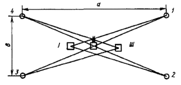 Полевой стенд для испытаний нивелиров включает в себя нивелирную сеть, образующую на местности фигуру в виде прямоугольника с размерами сторон а » 100 м и b » 30 м, вершины которого закреплены реперами. На каждом репере неподвижно и вертикально устанавливают нивелирные станции. Станцию II (черт. 1) располагают в центре фигуры, станции I и III - на продольной оси примерно в 10 м по обе стороны от станции II. Станции IV и V (черт. 2) располагают примерно в 50 м по обе стороны от станции II.